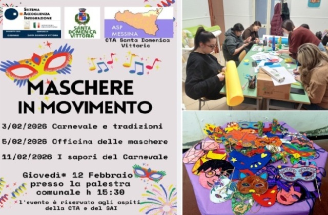 (Eva Casella) SANTA DOMENICA VITTORIA. Giovedì 12 febbraio, a partire dalle ore 15:30, gli ospiti beneficiari del Progetto SAI di Santa Domenica Vittoria, avente come ente attuatore il Consorzio Umana Solidarietà, coordinato dalla dottoressa Alice Valeria Attinà, accompagnati dall’assistente sociale la dottoressa Carmela Farina, dalla docente la dottoressa Eva Casella e dagli operatori presenti in struttura, hanno concluso gioiosamente il Progetto sul Carnevale “Maschere in Movimento”, realizzato insieme alla CTA di Santa Domenica Vittoria.