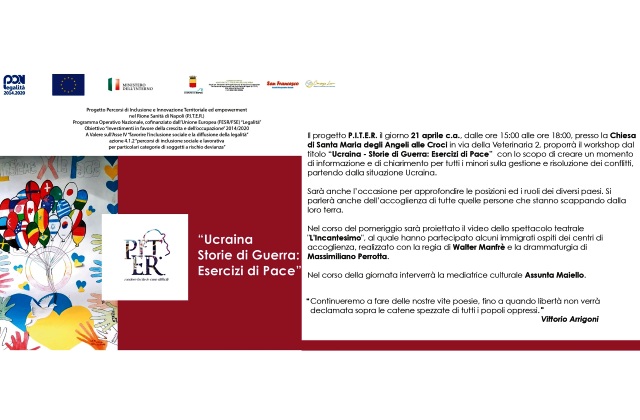 Progetto P.I.T.E.R., Rione Sanità: giovedì 21 aprile, ore 15-18, chiesa Santa Maria degli Angeli alle Croci, workshop “Ucraina - Storie di guerra: esercizi di Pace”