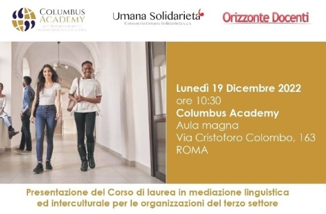 Consorzio Umana Solidarietà e Columbus Academy presentano a Roma, il 19 dicembre, il Corso di laurea in ‘Mediazione linguistica ed interculturale per le organizzazioni del Terzo settore’