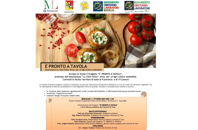 (Salvo Cona) TUSA. Il progetto “E’ PRONTO A TAVOLA” - promosso dall’associazione “La Città Felice” onlus, per un’agri-cultura sostenibile, avviato in Sicilia con il coinvolgimento dei territori di 9 province e di 15 Comuni - sarà presentato a Tusa (ME), Mercoledì 11 Ottobre 2023, alle ore 17.00, presso l’Istituto Comprensivo Don Lorenzo Milani, Via Roma n.1 .